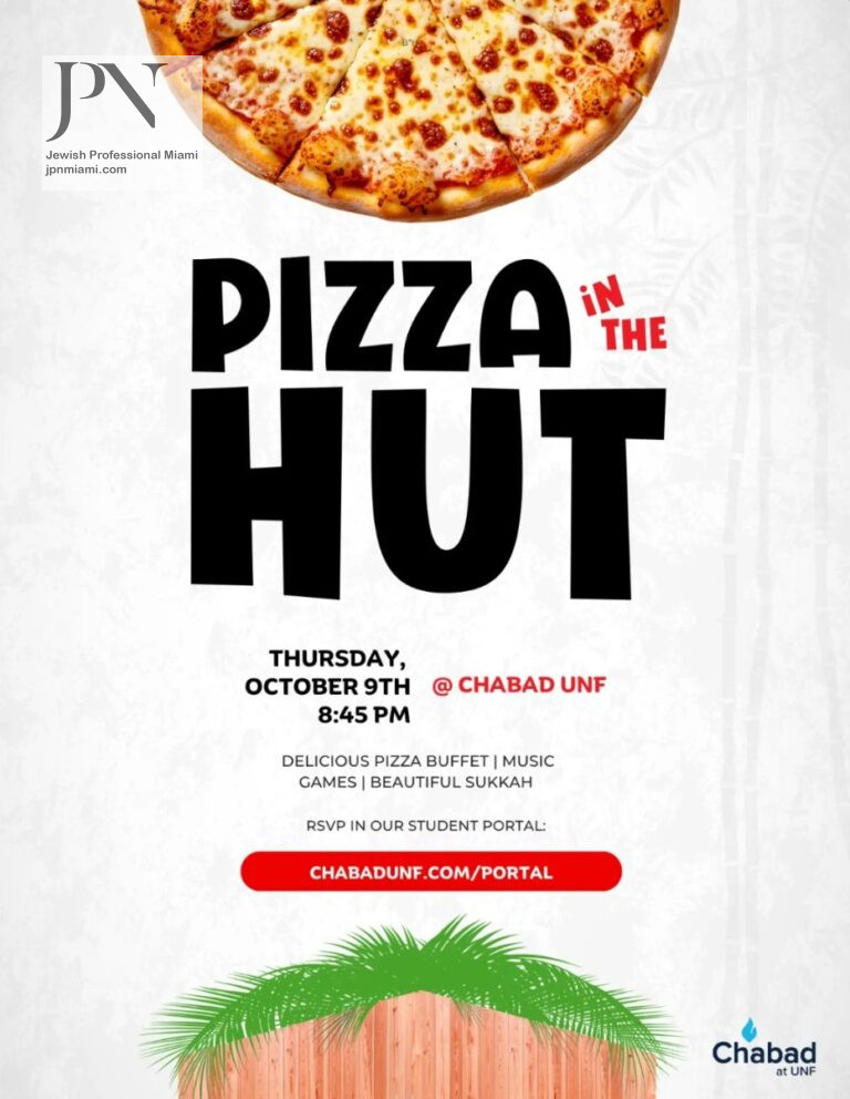 Details: Pizza in the Hut – Enjoy a delicious pizza buffet, music, games, and a beautiful sukkah experience with Chabad at UNF. RSVP required via student portal.