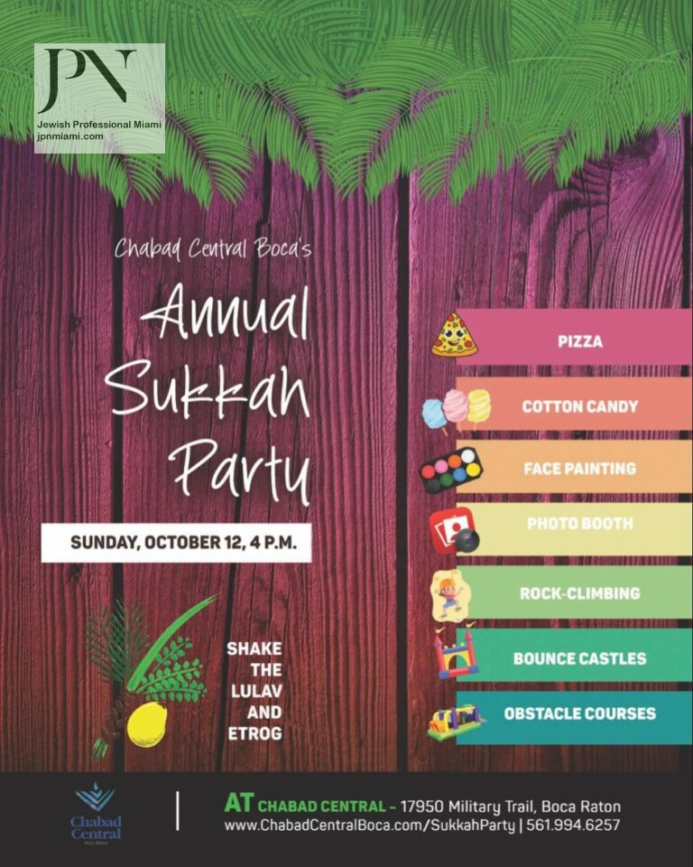 Details: Chabad Central Boca’s Annual Sukkah Party – Enjoy an afternoon of pizza, cotton candy, face painting, photo booth, rock climbing, bounce castles, obstacle courses, and the mitzvah of shaking the Lulav and Etrog.