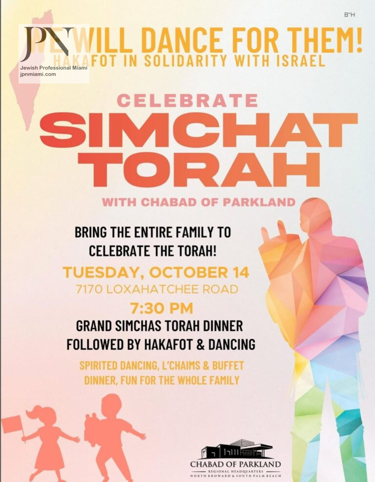 Details: Celebrate Simchat Torah with Chabad of Parkland – Grand Simchas Torah Dinner followed by Hakafot and spirited dancing in solidarity with Israel. L’chaims, buffet dinner, and fun for the whole family.