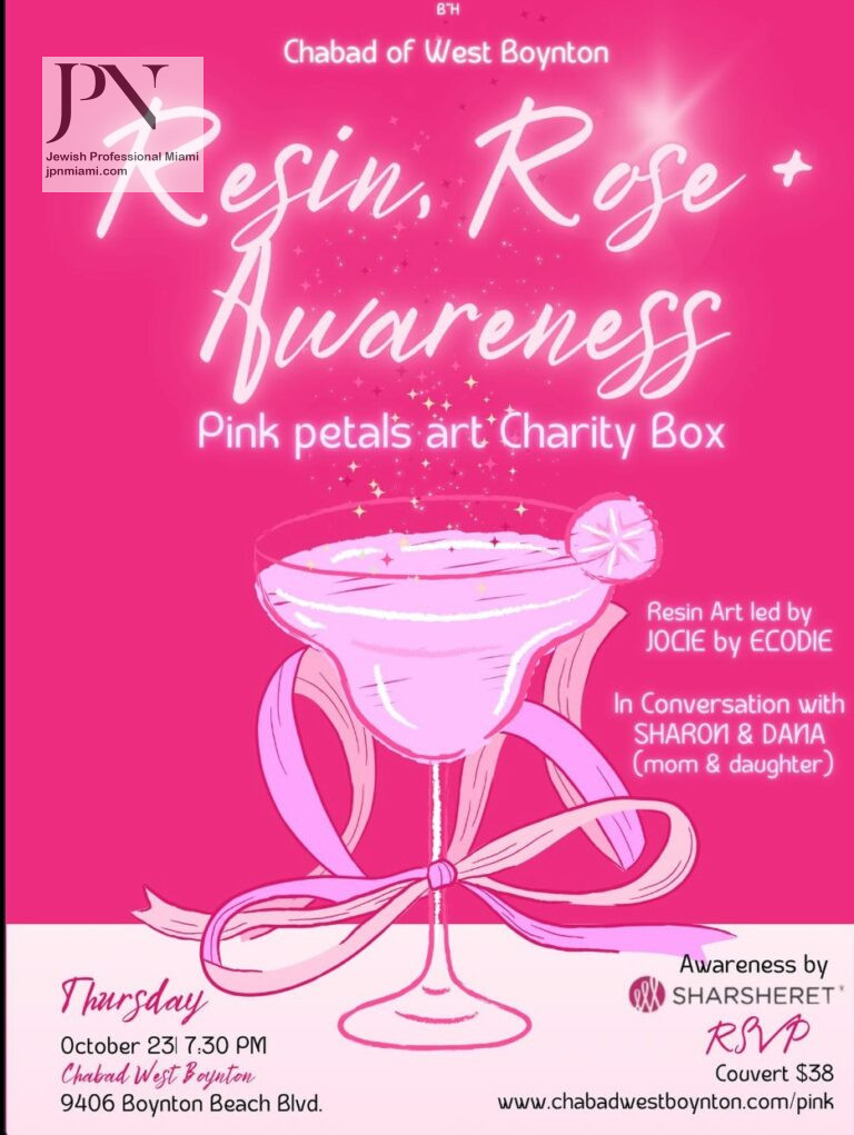 Details: Resin, Rose & Awareness – A pink petals art charity box event featuring resin art led by Jocie of Ecodie and a conversation with Sharon & Dana (mother and daughter). Hosted by Chabad of West Boynton in partnership with Sharsheret. Covert: $38.