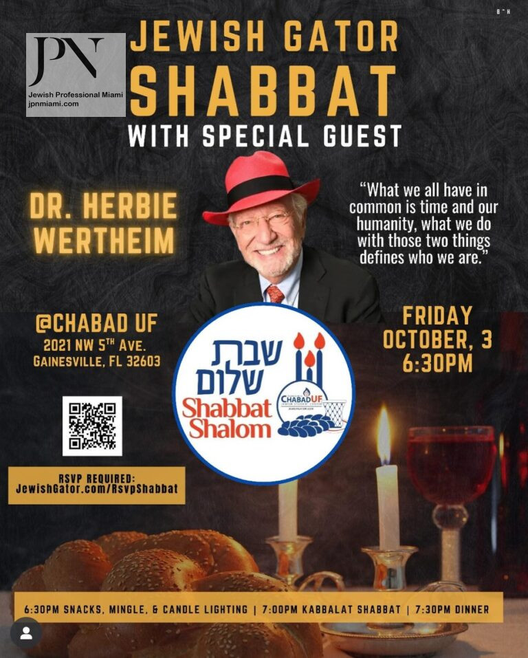 Details: Jewish Gator Shabbat with special guest Dr. Herbie Wertheim. Evening includes snacks, mingling, candle lighting, Kabbalat Shabbat, and dinner. RSVP required.