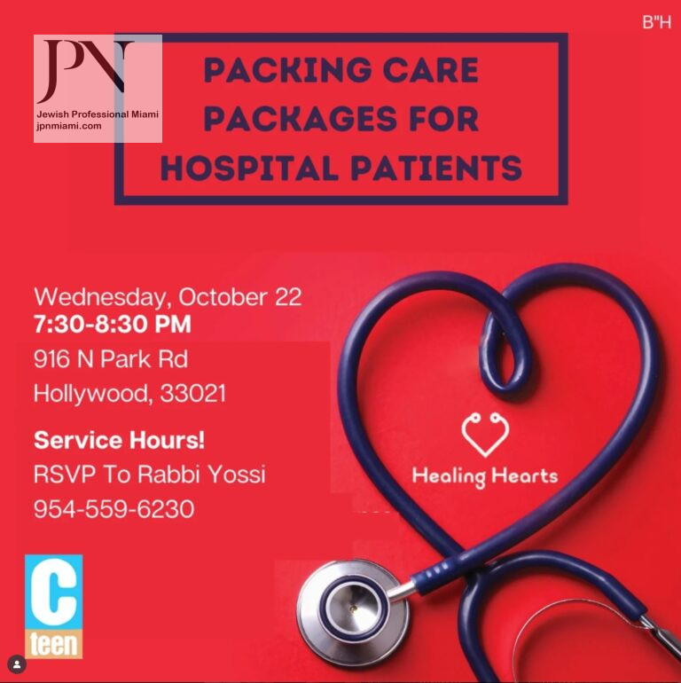Details: Packing care packages for hospital patients — a volunteer event offering service hours. RSVP to Rabbi Yossi at 954-559-6230.