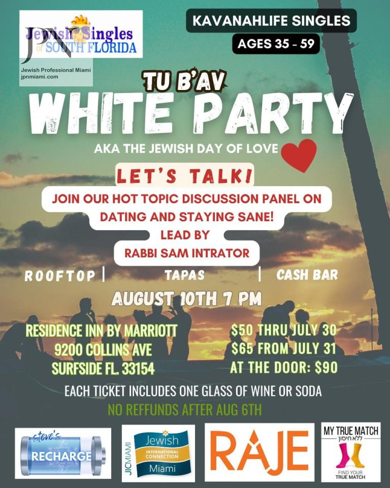 Details: Jewish Singles of South Florida and KavanahLife Singles present a Tu B’Av White Party for ages 35–59. Celebrate the Jewish Day of Love with rooftop views, kosher food and beverages, and an interactive discussion on “Staying Sane While Dating” led by Rabbi Sam Intrator. Attendees may volunteer to be part of the panel. Each ticket includes a glass of wine or soda. No refunds after August 6.