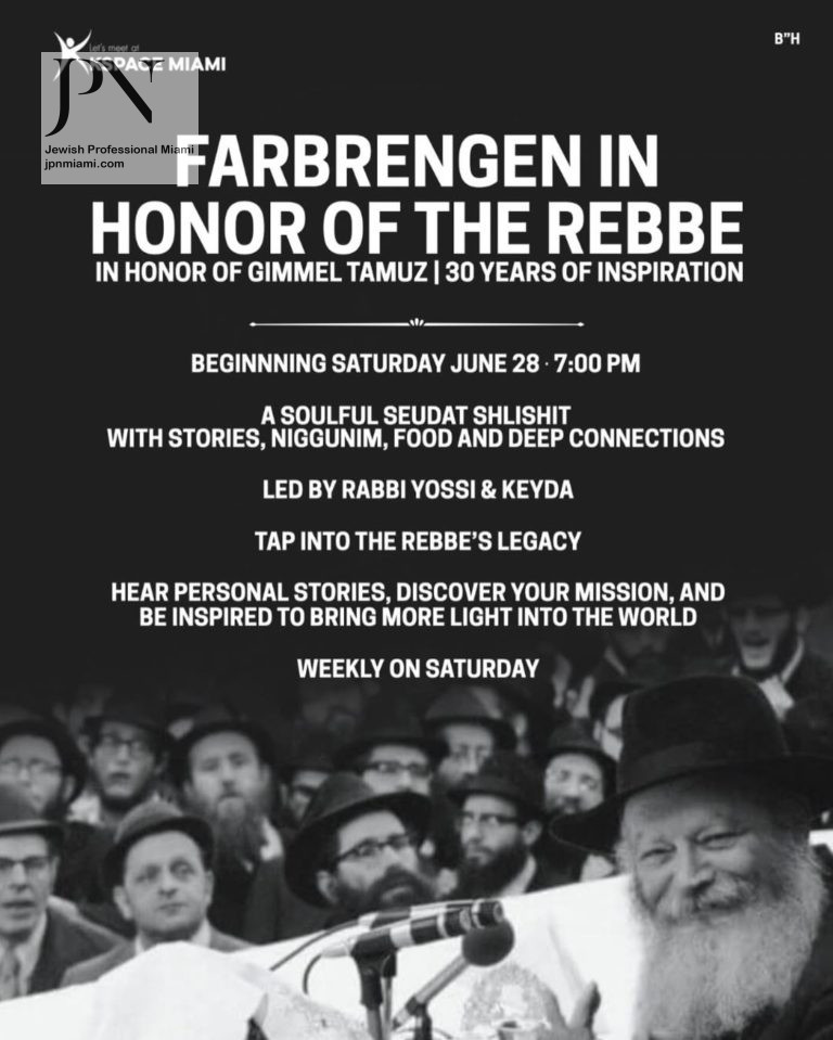 Details: Farbrengen in honor of the Rebbe, commemorating Gimmel Tamuz and 30 years of inspiration. A soulful Seudat Shlishit featuring stories, niggunim, food, and meaningful connections. Led by Rabbi Yossi & Keyda. Weekly sessions will tap into the Rebbe’s legacy, featuring personal stories and inspiration to bring more light into the world.