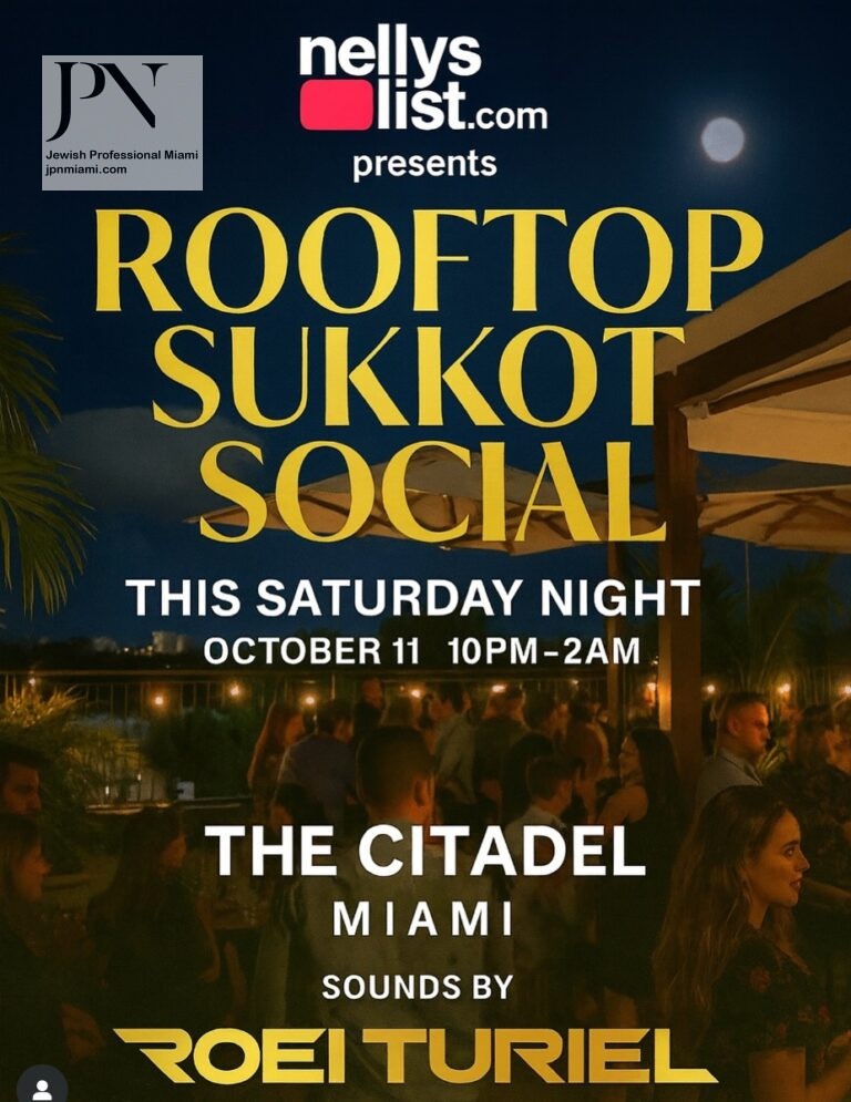 Details: Rooftop Sukkot Social – Presented by NellysList. A late-night Sukkot celebration featuring music by Roei Turiel at one of Miami’s iconic rooftop venues.