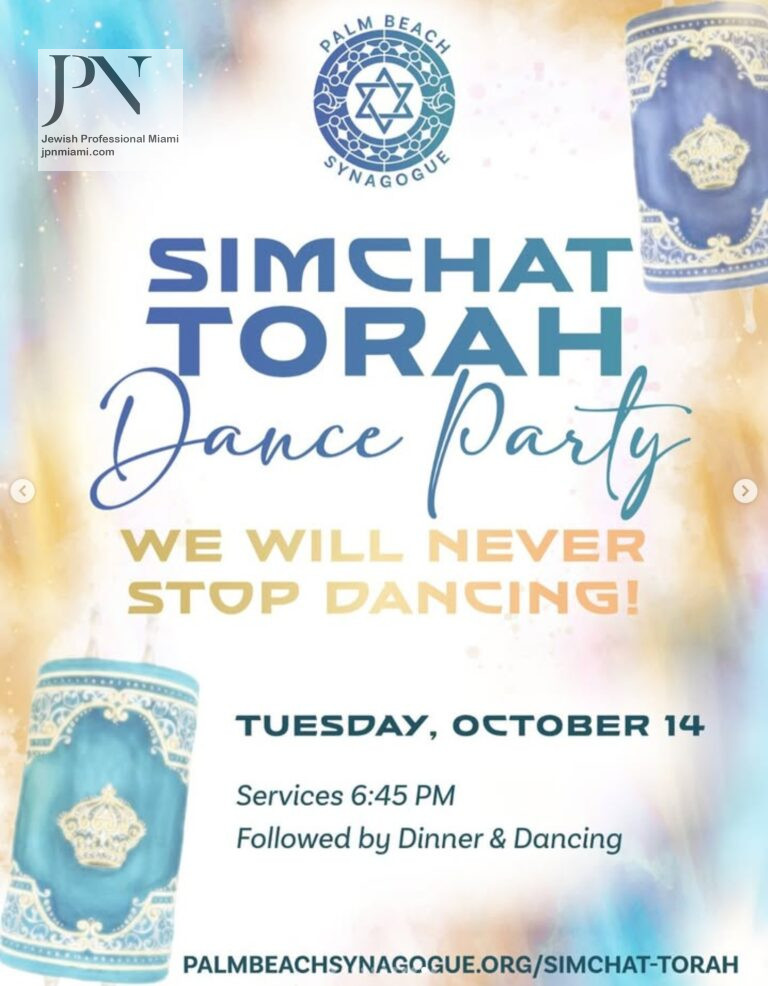 Details: Simchat Torah Dance Party – Celebrate with services, dinner, and non-stop dancing hosted by Palm Beach Synagogue.