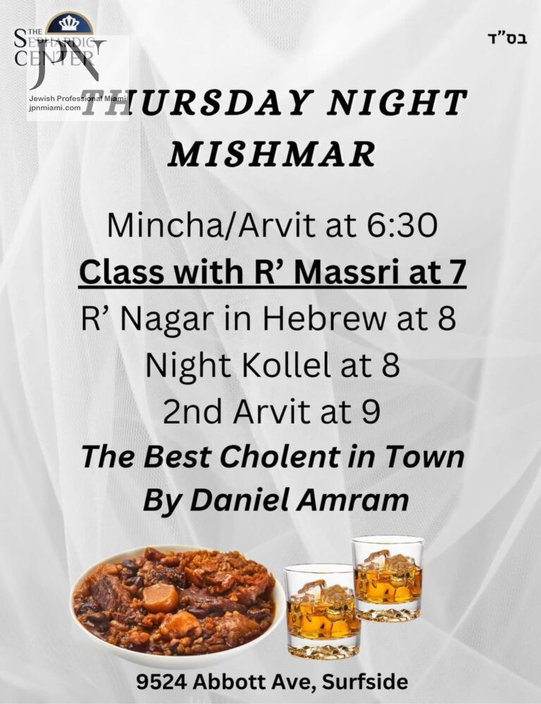 Details: Thursday Night Mishmar featuring classes with Rabbi Massri and Rabbi Nagar, Night Kollel, and “The Best Cholent in Town” by Daniel Amram.