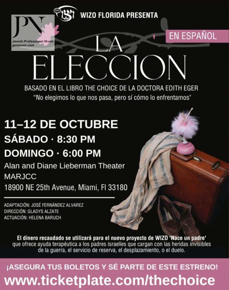 Details: WIZO Florida presents La Elección (in Spanish), a theatrical performance based on the book *The Choice* by Dr. Edith Eger. The play explores how we respond to life’s challenges. Proceeds benefit WIZO’s project “Nace un padre,” offering therapeutic support to Israeli parents affected by war and displacement.