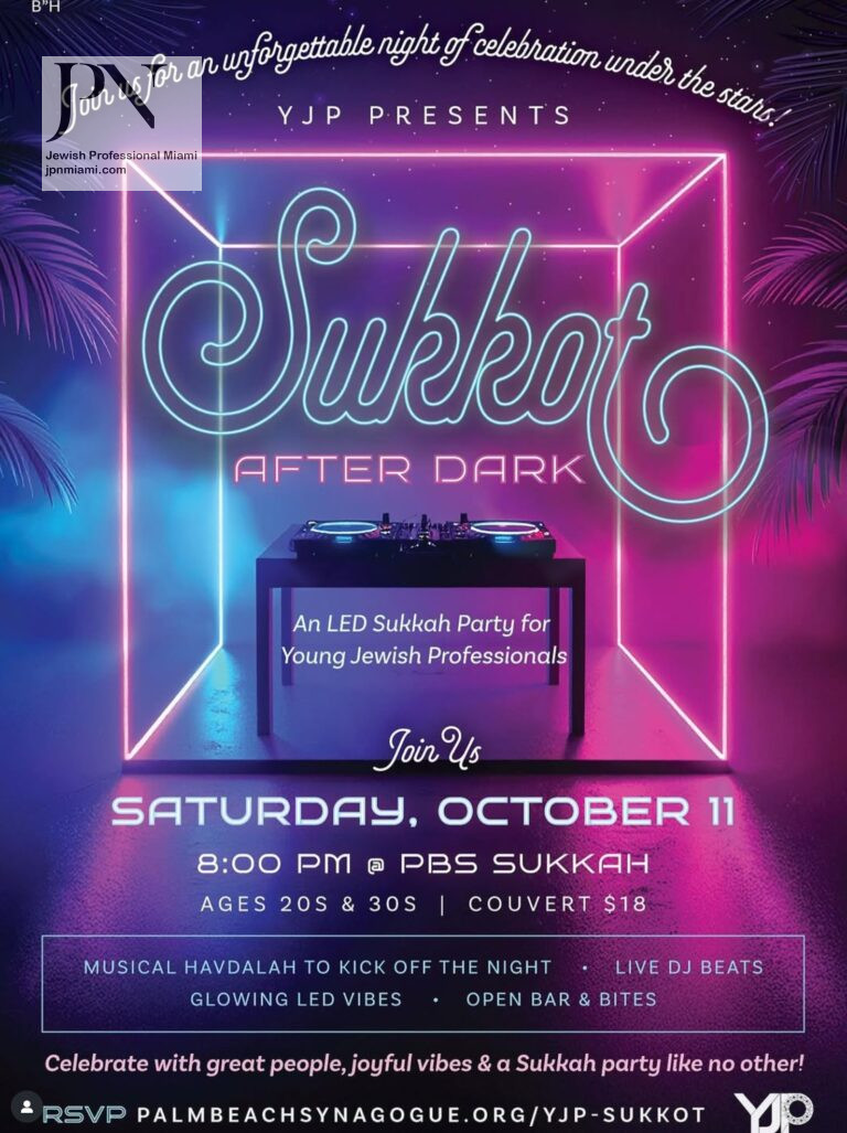 Details: Sukkot After Dark – An LED Sukkah Party for Young Jewish Professionals in their 20s and 30s. Featuring musical Havdalah, glowing LED vibes, live DJ beats, open bar, and bites. Couvert: $18.